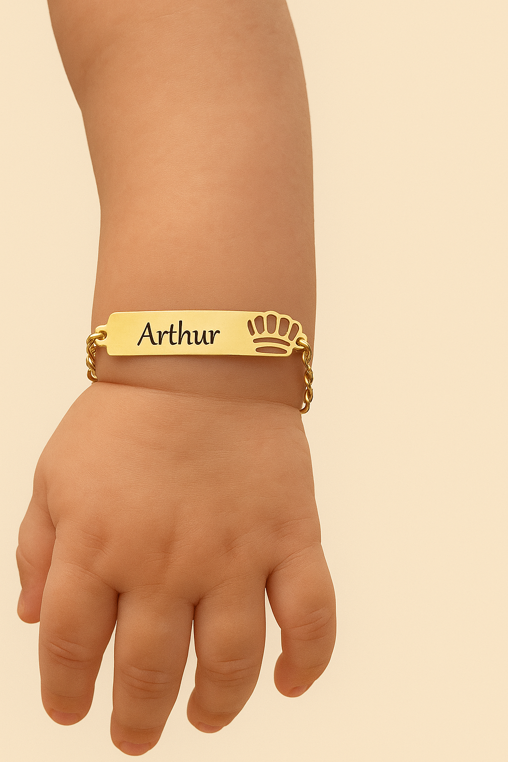Para quem busca um presente com imponência e doçura, a Pulseira Realeza Baby é a escolha ideal. O detalhe da coroa simboliza o valor único de cada bebê, e o banho de ouro 18K traz a sofisticação que a ocasião merece. Essa pulseira é mais do que um acessório — é uma homenagem à realeza que existe em cada criança e uma forma de eternizar seu nome com estilo e emoção.